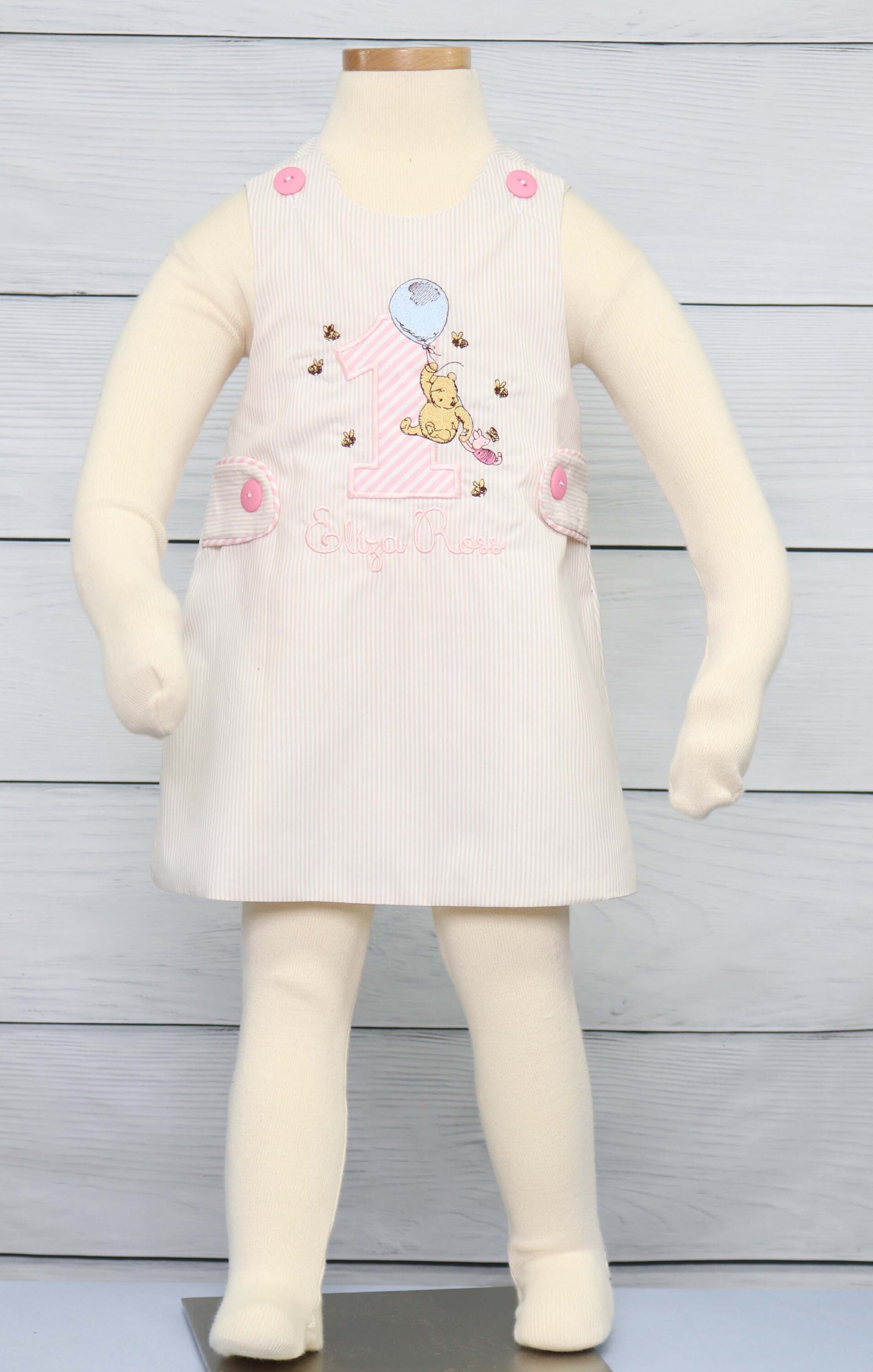 This baby girl classic Winnie the Pooh outfit is shown in tan stripe fabric and can be appliqued with the Pooh Bear and Piglet birthday design. A first name can also be added to this adorable dress. This 1st birthday baby jumper can come in your choice of design options and can come with, or without, a peter pan collar shirt. The shirt can come with piping to match the outfit or can be piped in white. Numbers 1-5 are available. Please leave the number you need in the "note to seller" box at checkout
