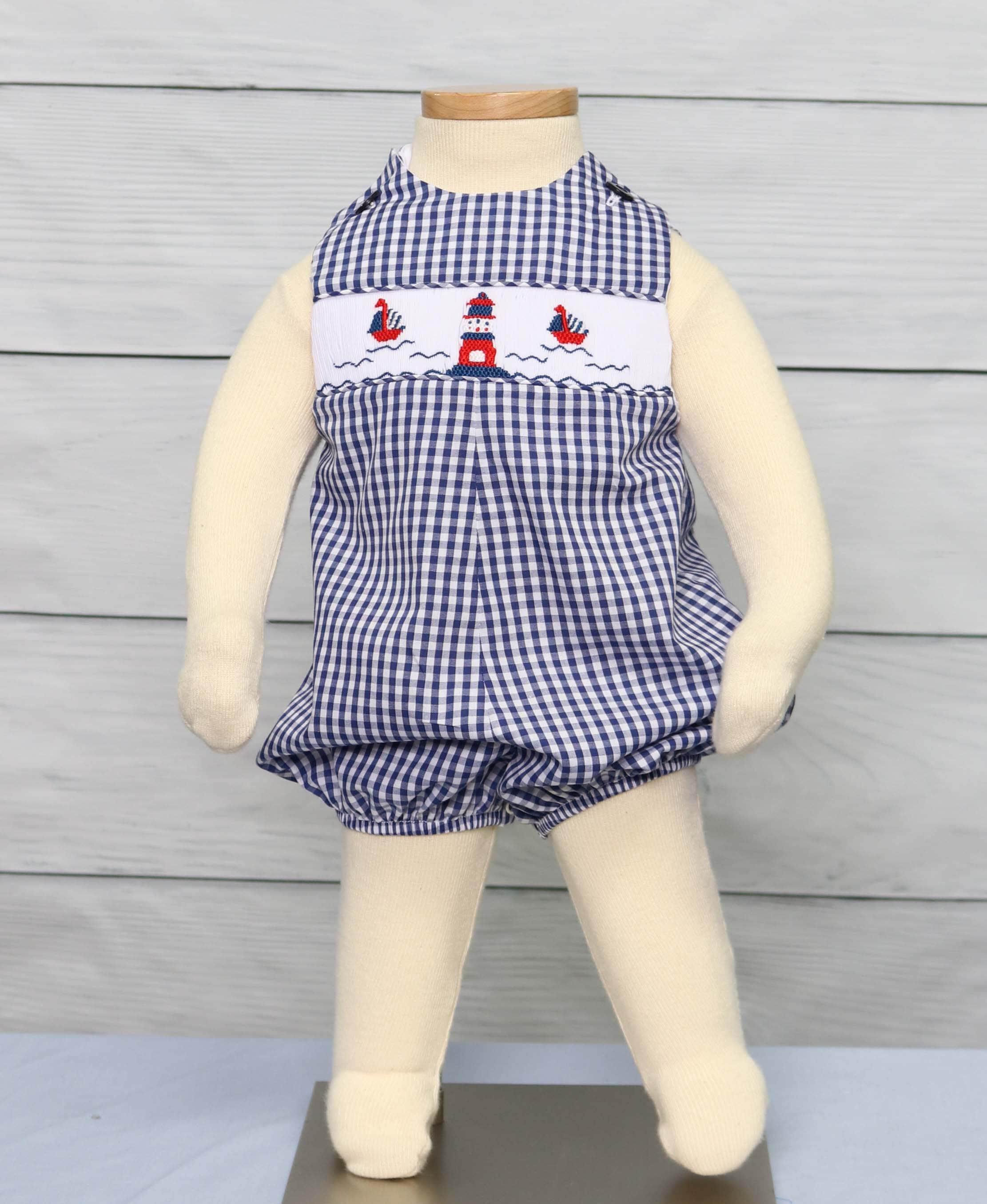 Celebrate in a baby boy 4th of July outfit in style with a sweet patriotic outfit from Zuli Kids Clothing. Baby July 4th outfits are jon jon shortalls and is navy gingham with handmade smocked flags.