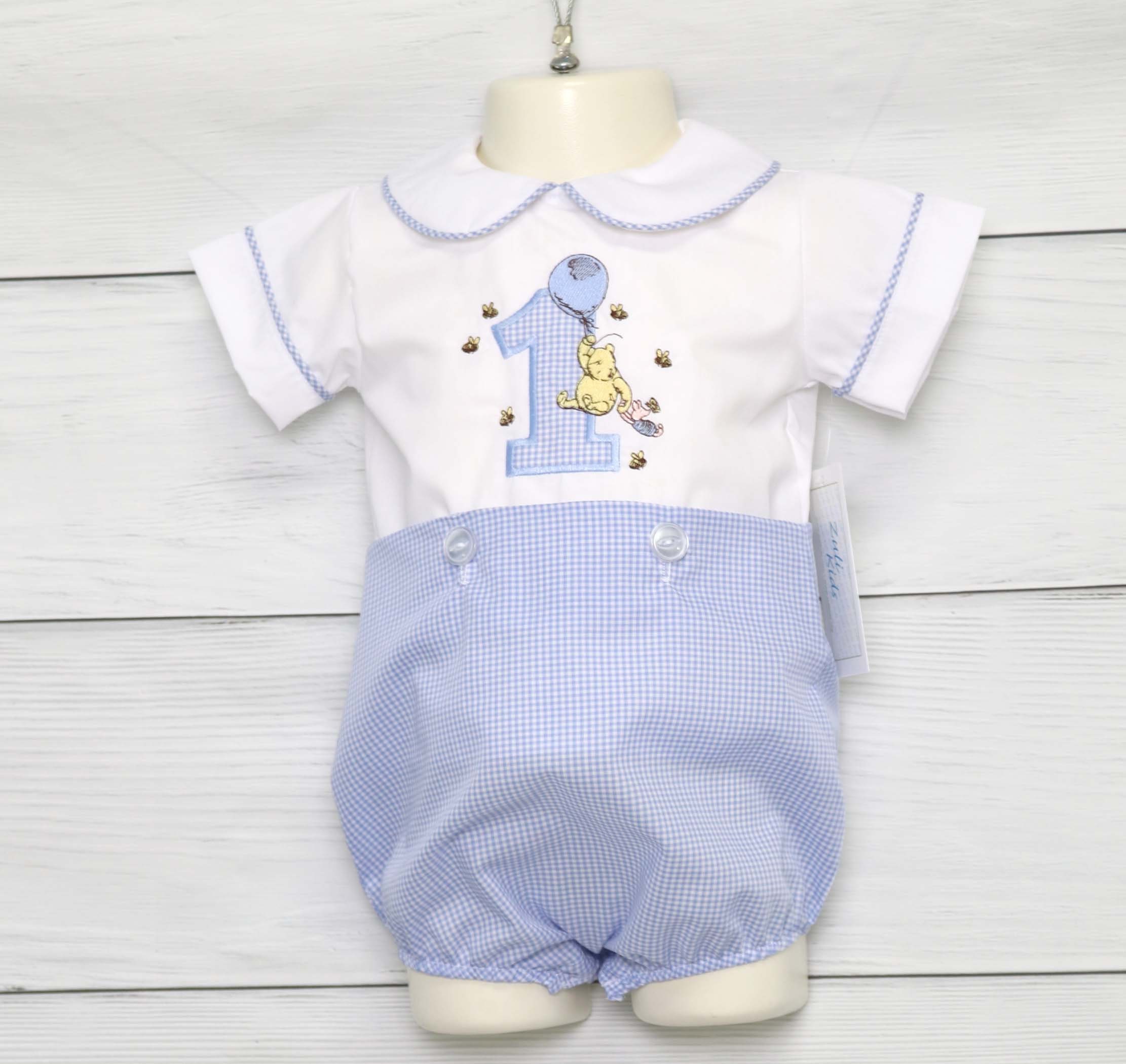 This precious baby boy 1st birthday outfit is shown with blue gingham button-on bubble shorts with a white shirt that has matching blue gingham piping in the collars and sleeves available plain (no embroidery on front), or with classic Winnie the Pooh inspired embroidery.