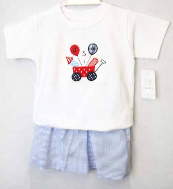 Boys shorts are blue gingham with elastic waist. Tee shirt is white with applique 4th of July Wagon.