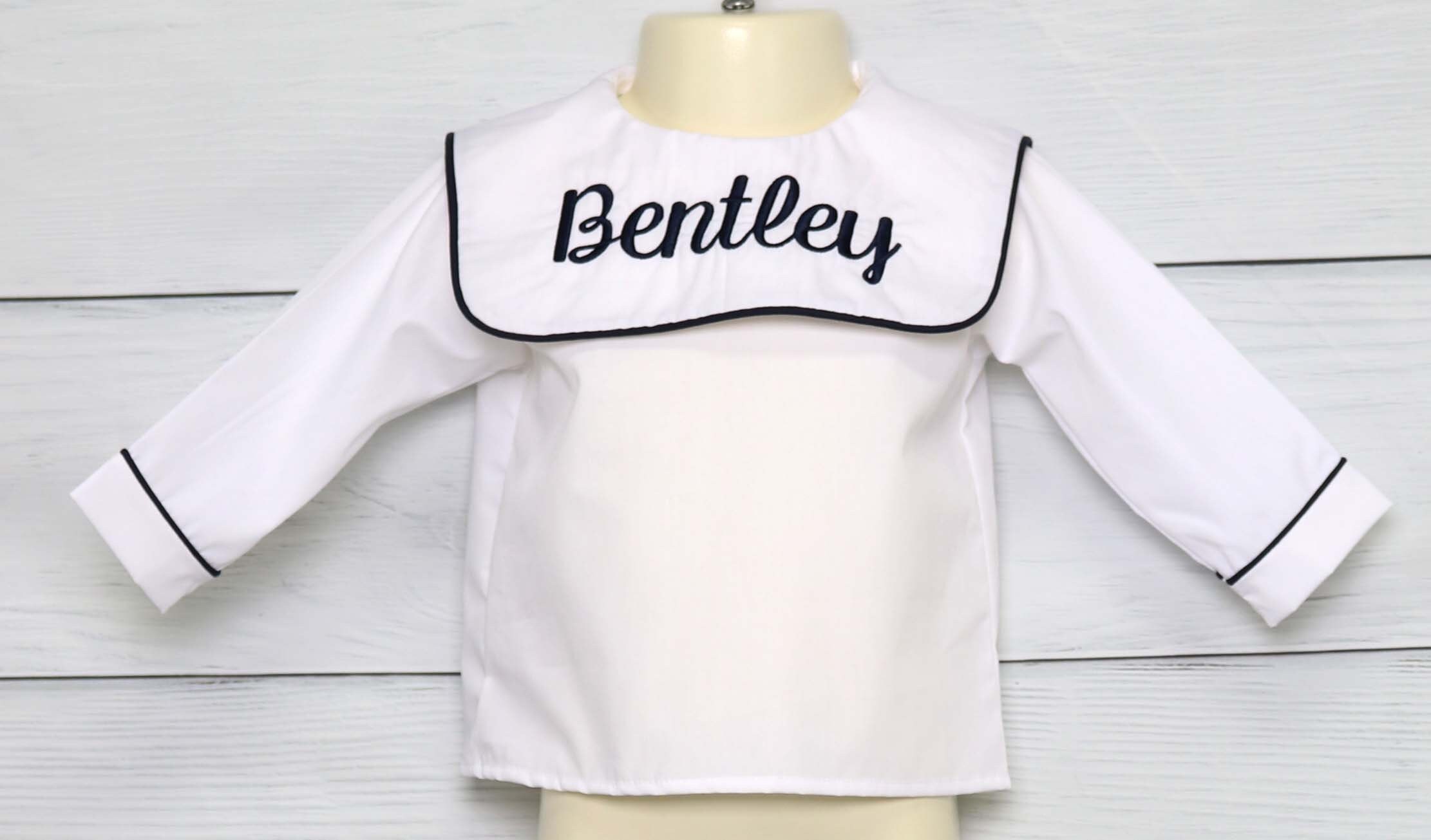 Shirt is shown in white with navy piping and a navy monogram. You can choose the color piping you want or we can do the piping to match the romper you are purchasing to match.