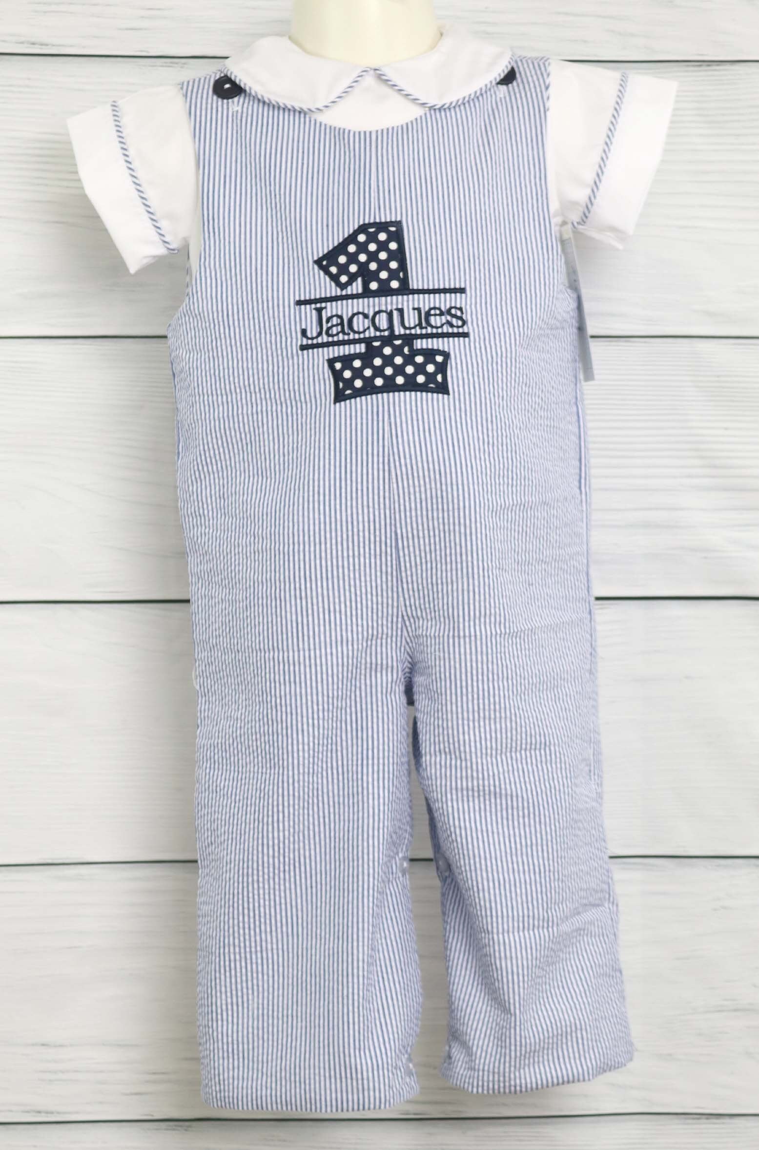 He will look precious in our baby boy first birthday outfit or even a 2nd birthday. Baby boy birthday outfit is a blue stripe cotton seersucker with a navy number or with a navy split number with your child's name in it. for a cake smash outfit. This is perfect for a cake smash outfit.