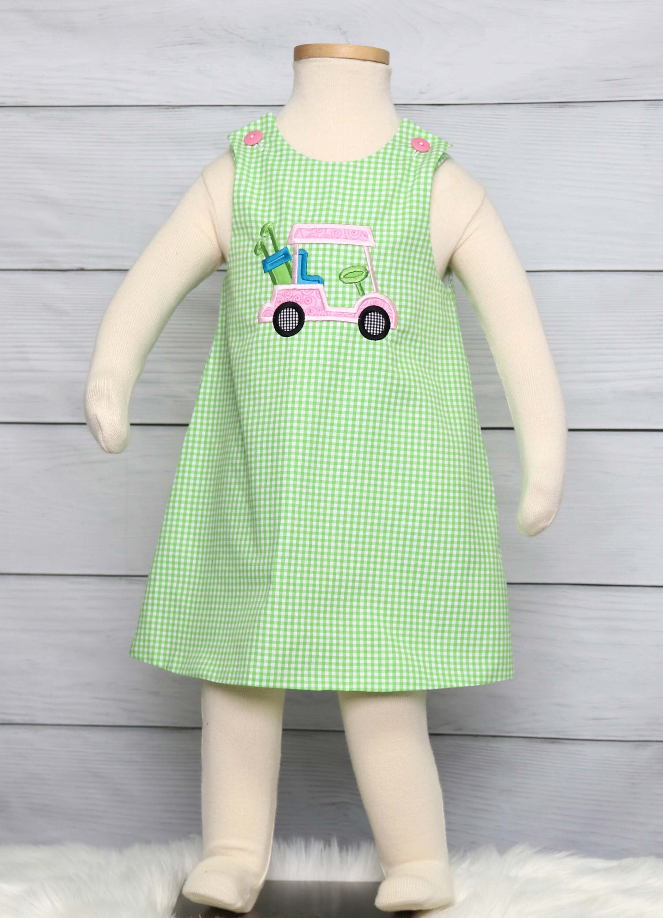 She will look amazing in a baby girl golf outfit by Zuli Kids. Baby golf dress is shown in green gingham fabric and can be appliqued with golf cart design. A first name can also be added to this adorable dress. This 1st birthday baby jumper can come in your choice of design options and can come with, or without, a peter pan collar shirt. Numbers 1-5 are available. Please leave the number you need in the "note to seller" box at checkout