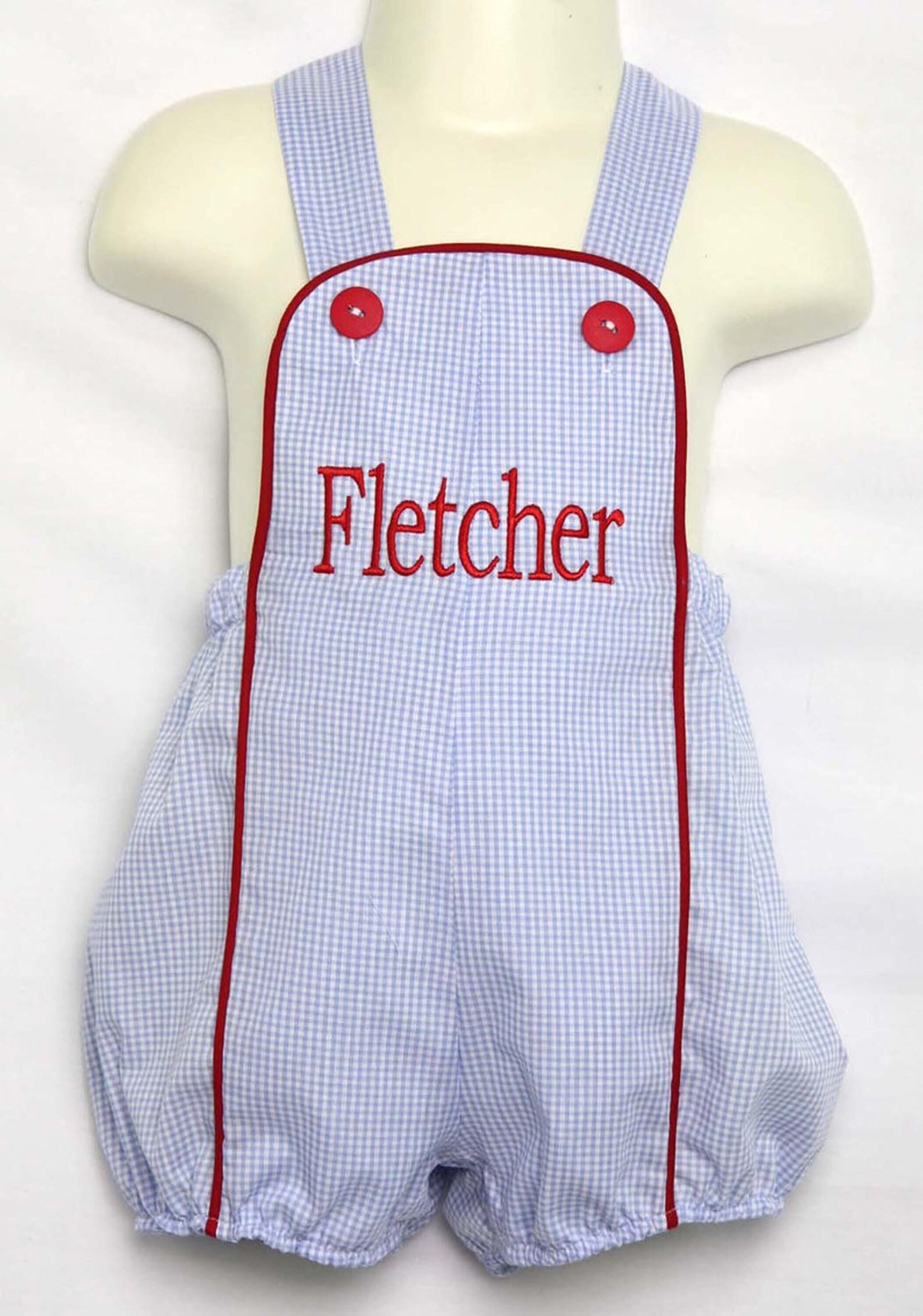 He will look precious in baby boy clothes by Zuli Kids. Baby overalls for boy are a gingham sun suits that comes in several colors. Toddler boy outfit is shown in blue gingham with red piping trim. Available plain or with monogram.