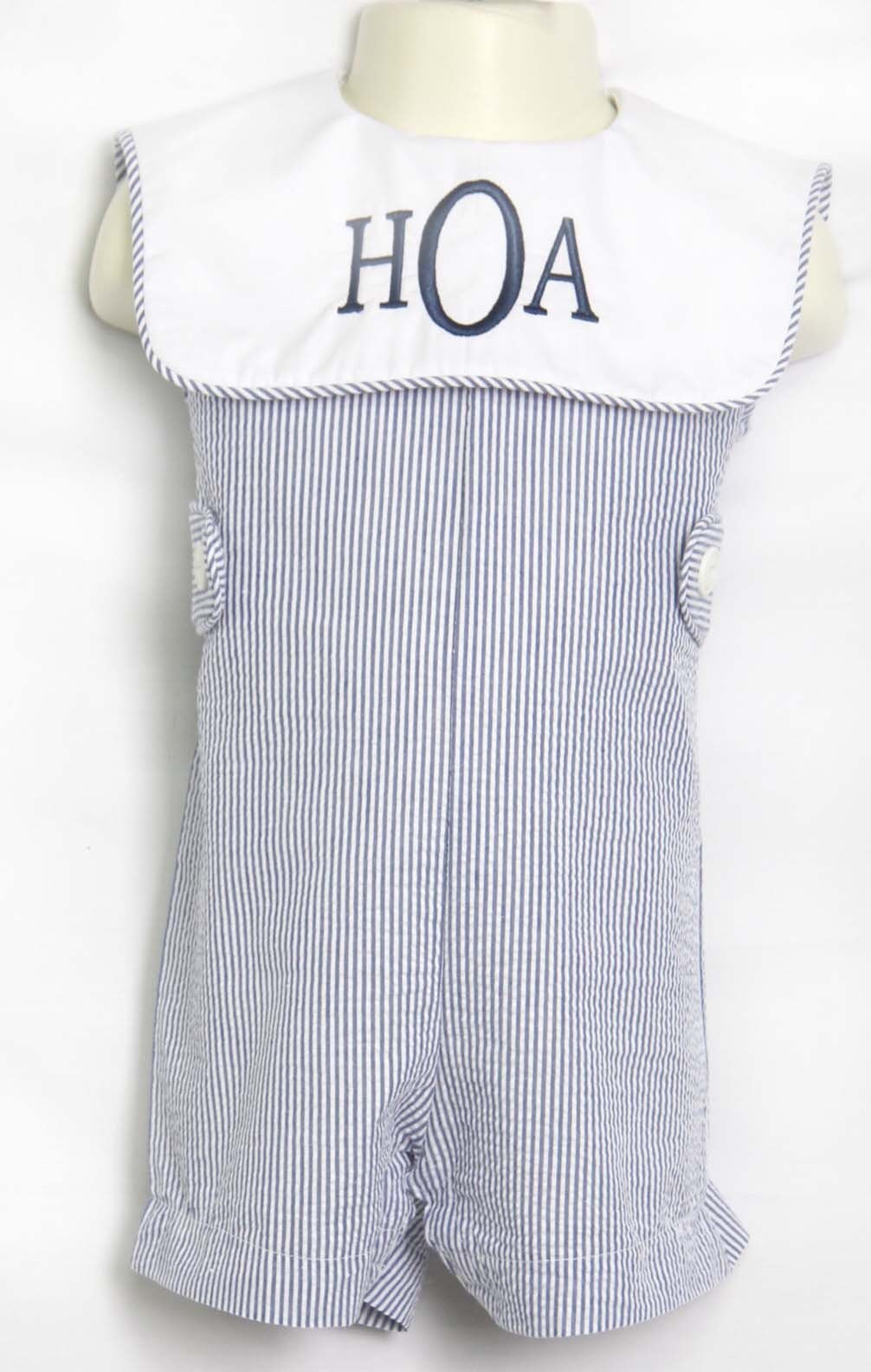 He will be super sweet in a baby rompers by Zuli Kids. Baby one piece is navy seersucker with side tabs and white square collar that is available plain or monogrammed. Perfect for a baby boy Easter outfit or any occasion that a baby boy dressy outfit is needed.