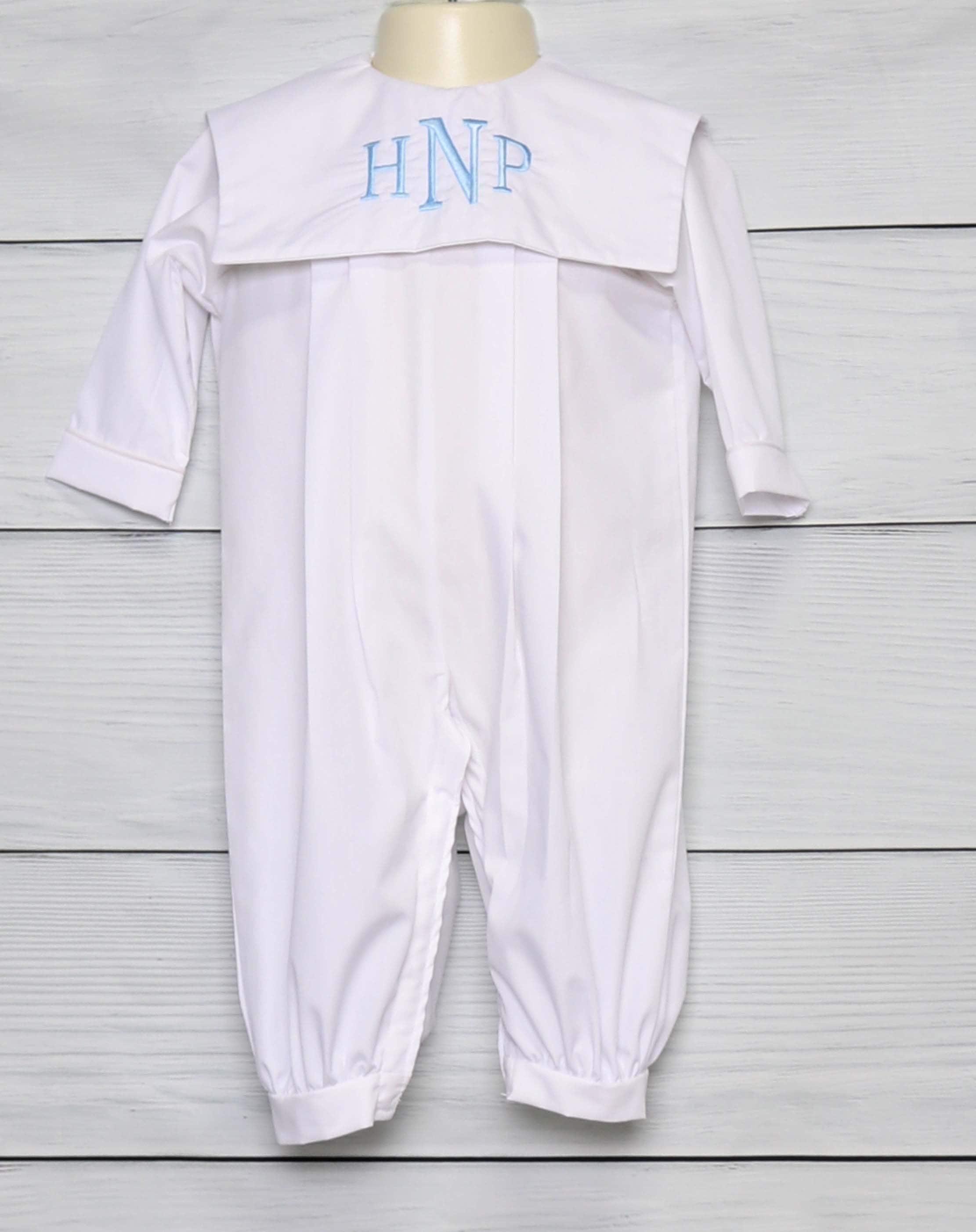 He will look amazing in a baptism outfits for boy by Zuli Kids.Baby boyoy christening outfit is a long bubble romper and is white and is shown with a monogram on a square bib collar in blue. Available plain, with monogram only or with monogram and crosses. Ivory sample shown so you can see the cross placement only. •