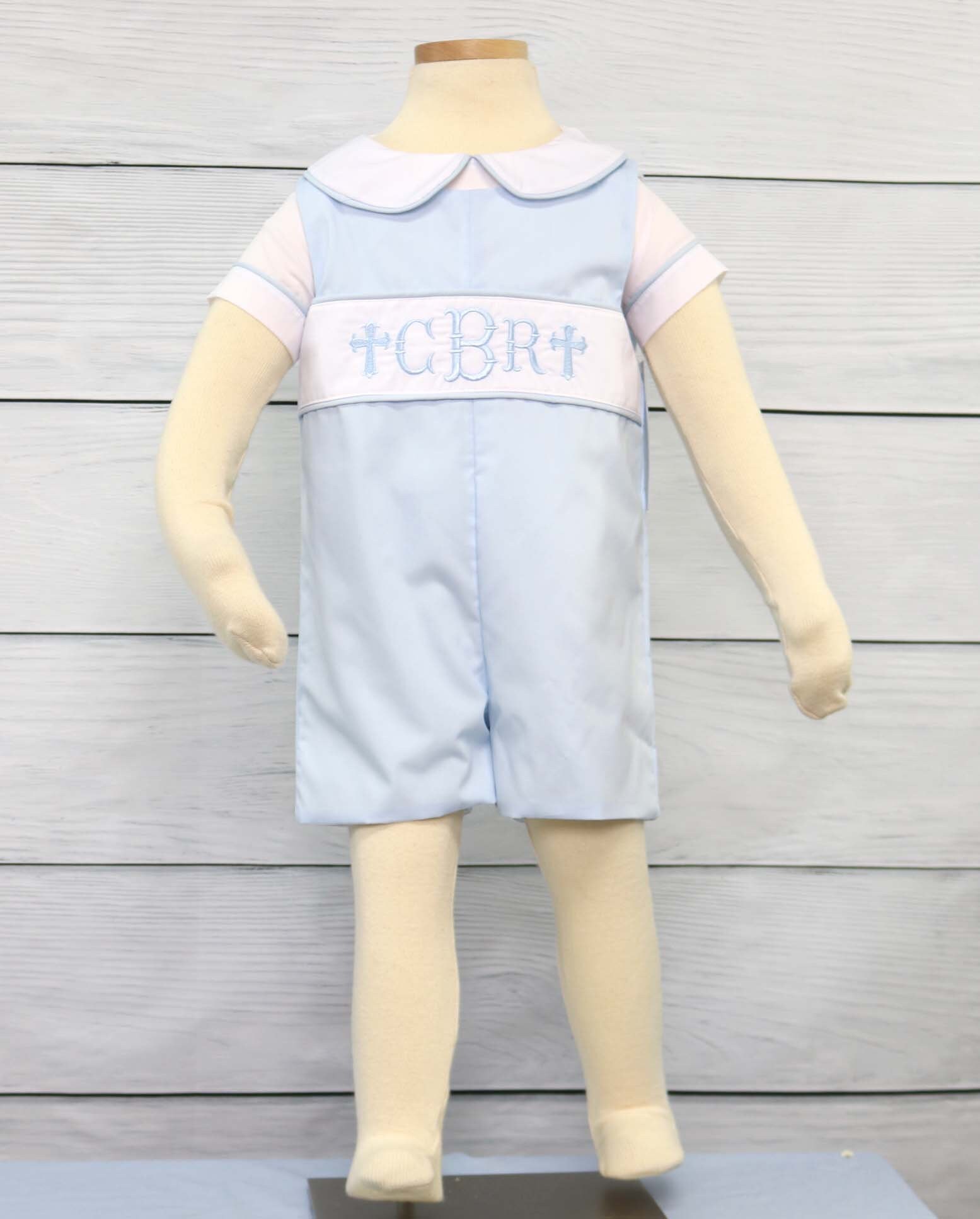 He will be ready for his special day in a boys baptism outfit by Zuli Kids. Baby boy baptism outfit is a baby Jon Jon in blue with blue piping and is shown with blue embroidery. It comes with a name or 3 letter monogram or can come with a monogram with cross on each side.