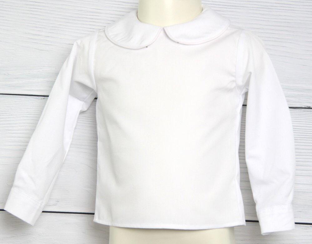 He will look stunning in boys dress shirts by Zuli Kids. Boys peter pan collar shirt is white and shown with white piping but available to match most of our baby boy outfits. Baby boy white dress shirt for baby boys are a staple in any baby boy's closet and will go under any of our Christmas Jon Jon, Smocked Jon Jon or Easter Jon Jon..'