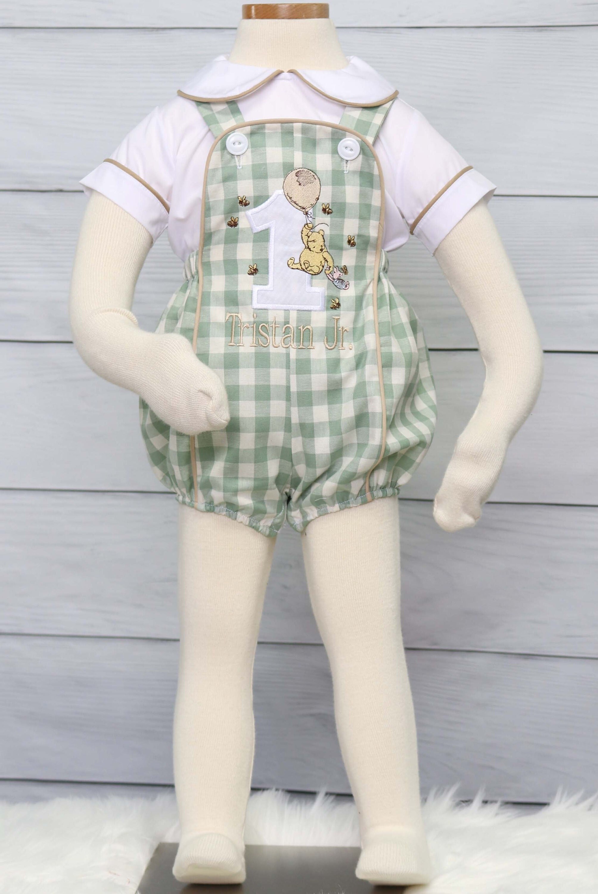 He will look stunning in a boys first birthday outfit by Zuli Kids. This classic bear birthday outfit is shown in sage plaid and can be appliquéd with a Classic first birthday design. A first name can also be added to this adorable toddler boy outfit. Available with or without shirt and with number 1 or 2.