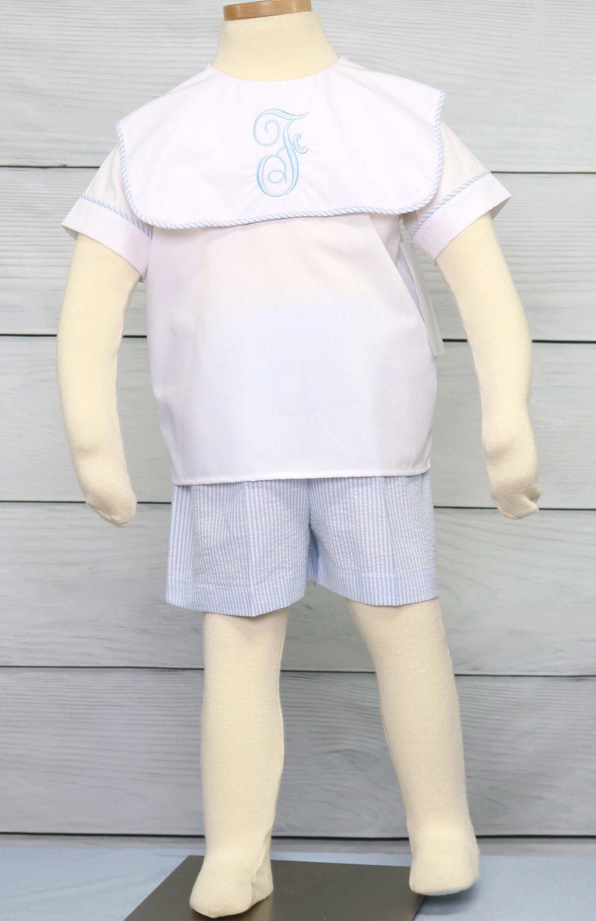He will look amazing for any special occasion in wedding outfits for baby boys by Zuli Kids. Wedding outfit for boy has blue shorts and a white baby boy dress shirt with square bib collar. Available plain or with monogram. Matching sibling outfits are perfect for a gender reveal party.
