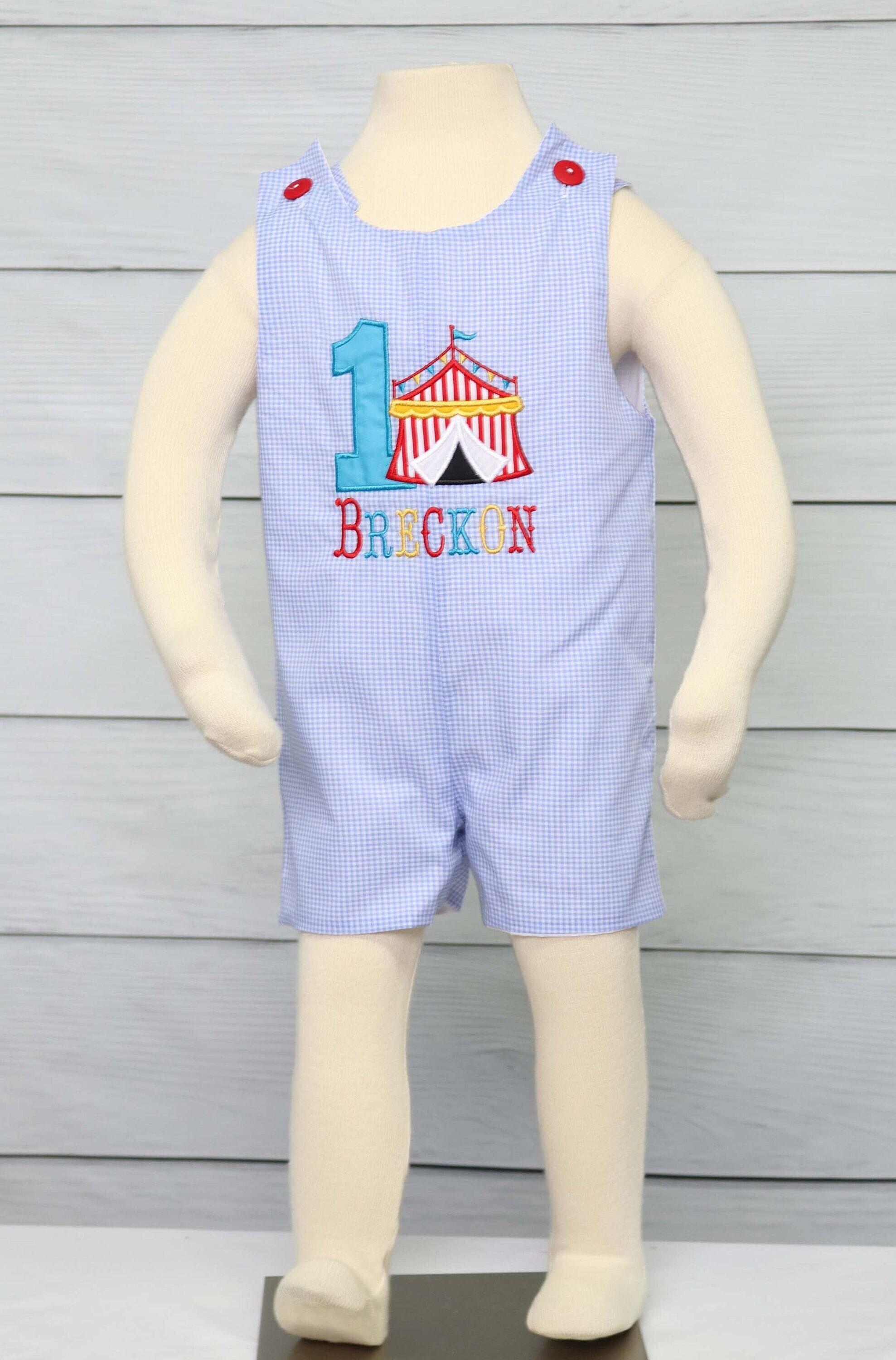He will look stunning for his circus party in a first birthday outfit boys by Zuli Kids. 1st birthday outfit is shown in baby blue gingham with a number 1 but is available with numbers 2, 3 or 4l. This is great for a cake smash outfit for boy as carnival themed party ideas. Can come with applique only or applique and baby's first name.