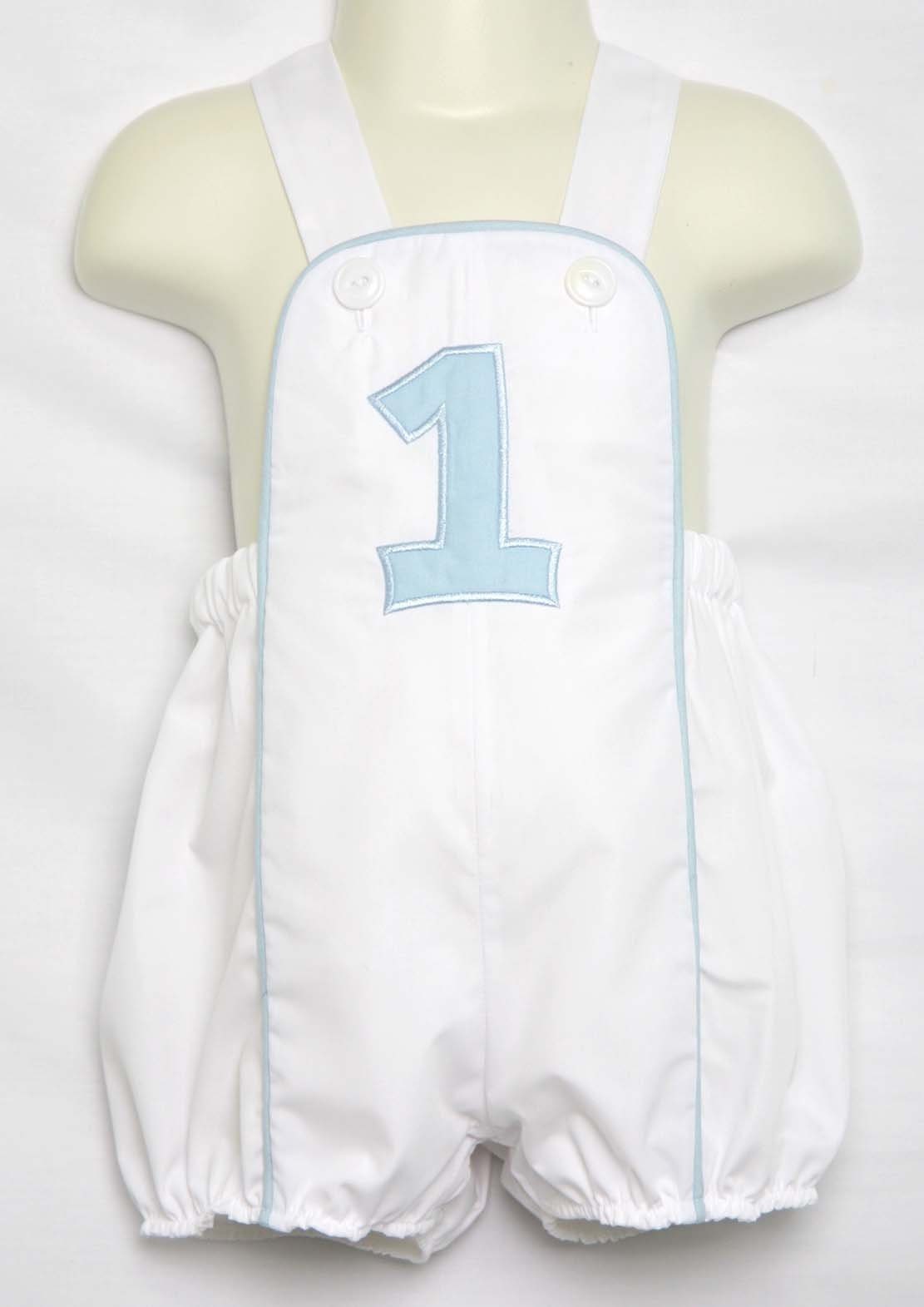 He will stand out at his frist birthday party in a first birthday outfit for boy by Zuli Kids. 1st birthday outfit for boy is a white baby sun suit and is shown with applique 1 and baby's first name. Available with applique number only or with number and baby's first name. Available is the number 2 for a second birthday.