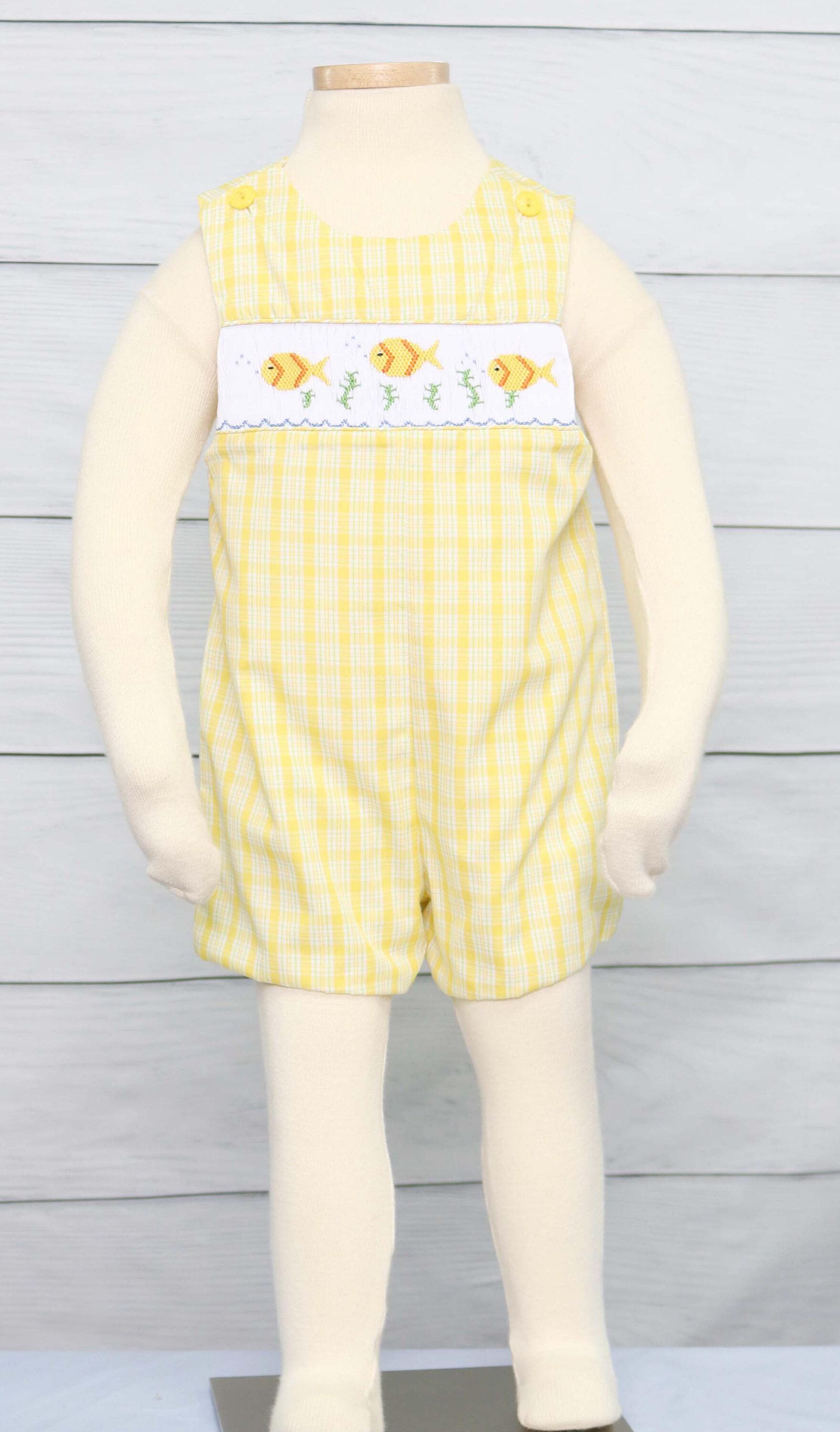 He will look super cute for his ofishally one birthday in a smocked jon jon by Zuli Kids. Smocked shortall is a yellow gingham jon jon with handmade smocking with gold fish. Time tested and mother approved, smocked clothes are a must-have for little ones! LAST ONE IN STOCK 18 Mo