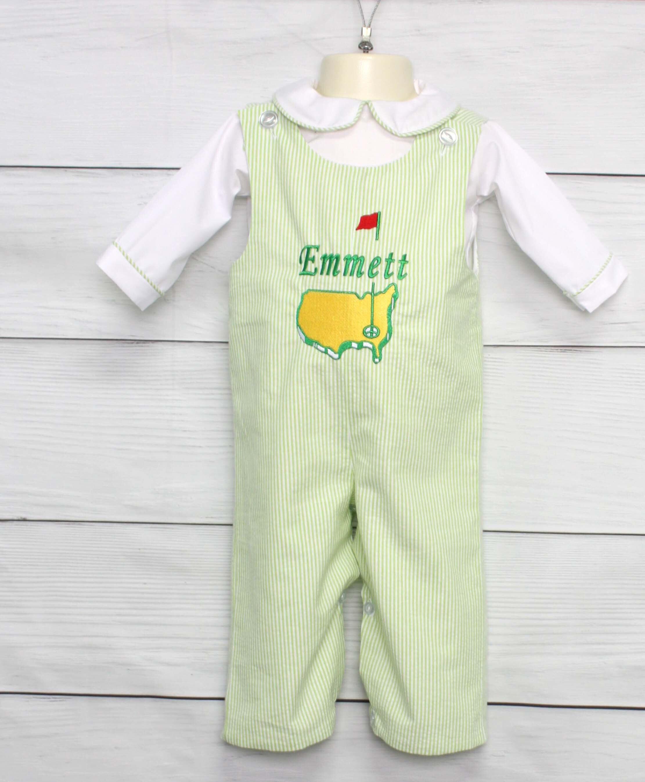 He will look preppy at kids golf clothes by Zuli Kids. Infant golf outfit is green seersucker fabric and has a golf tournament applique and can come with or without name or monogram.
