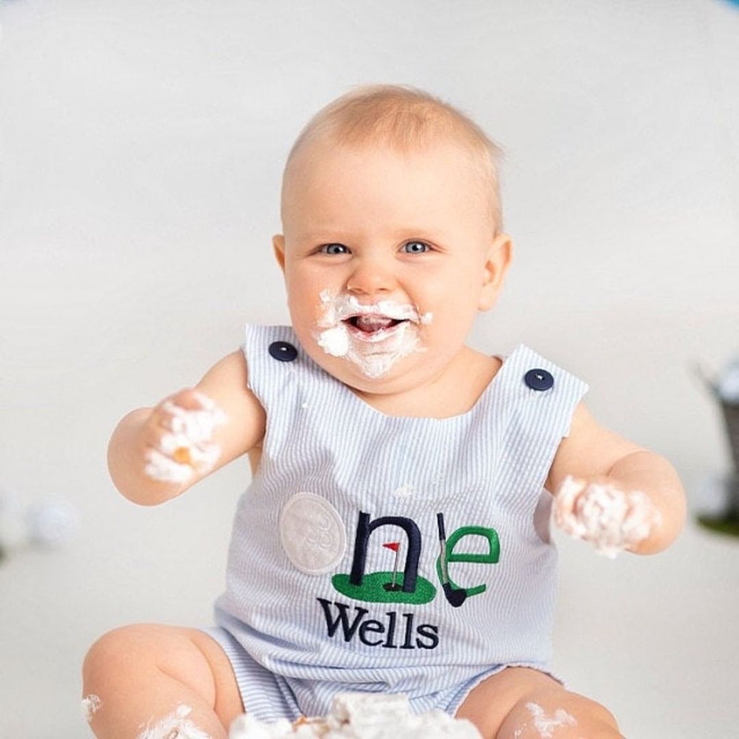 He will look super cute for his golf birthday in a baby boy golf outfit by Zuli Kids. Baby golf outfit is a blue stripe cotton seersucker with golf green embroidery and green buttons.and is perfect for that hole in one birthday party cake smash outfit. Comes with ONE golf design. Available with or withour monogram.