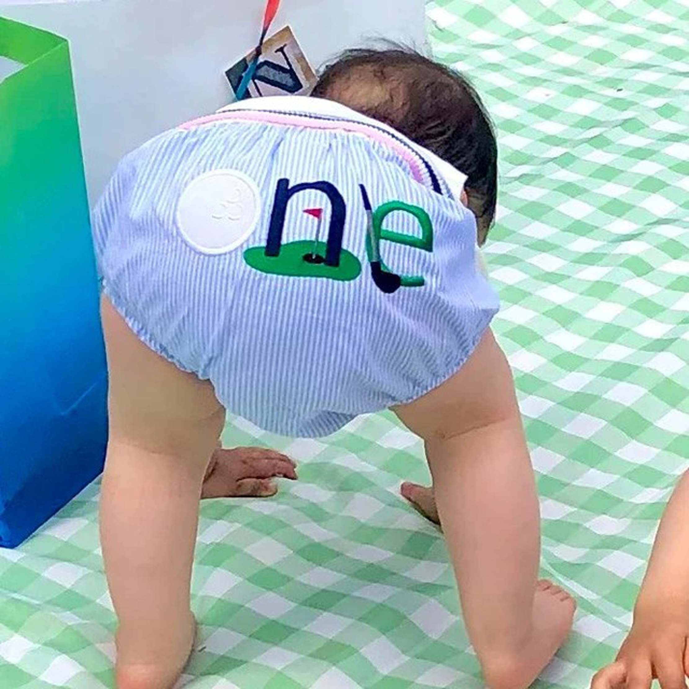 He will look amazing for his hole in one first birthday in a baby golf outfit by Zuli Kids. Golf birthday outfit is a diaper cover in blue seersucker with ONE golf design. Available with or without suspenders. (Please note: We only offer the tan suspenders in the first photo)