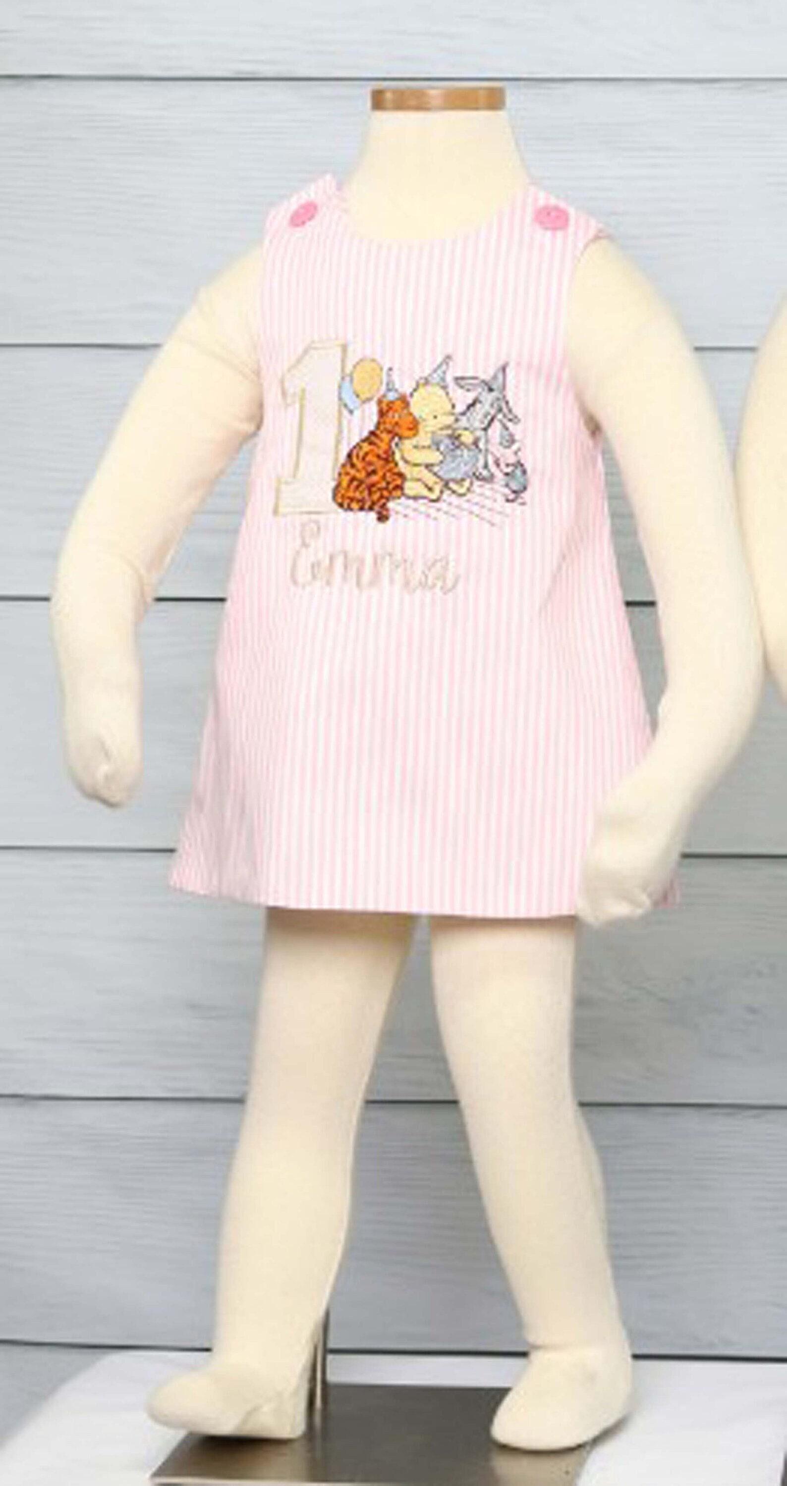 She will look amazing in a classic bear first birthday outfits for girls by Zuli Kids. First birthday outfit is pink stripe and available plain, with classic bear applique design or with bear and friends design and baby's first name. Numbers 1-5 are available. Matching sibling outfits available from link in product description