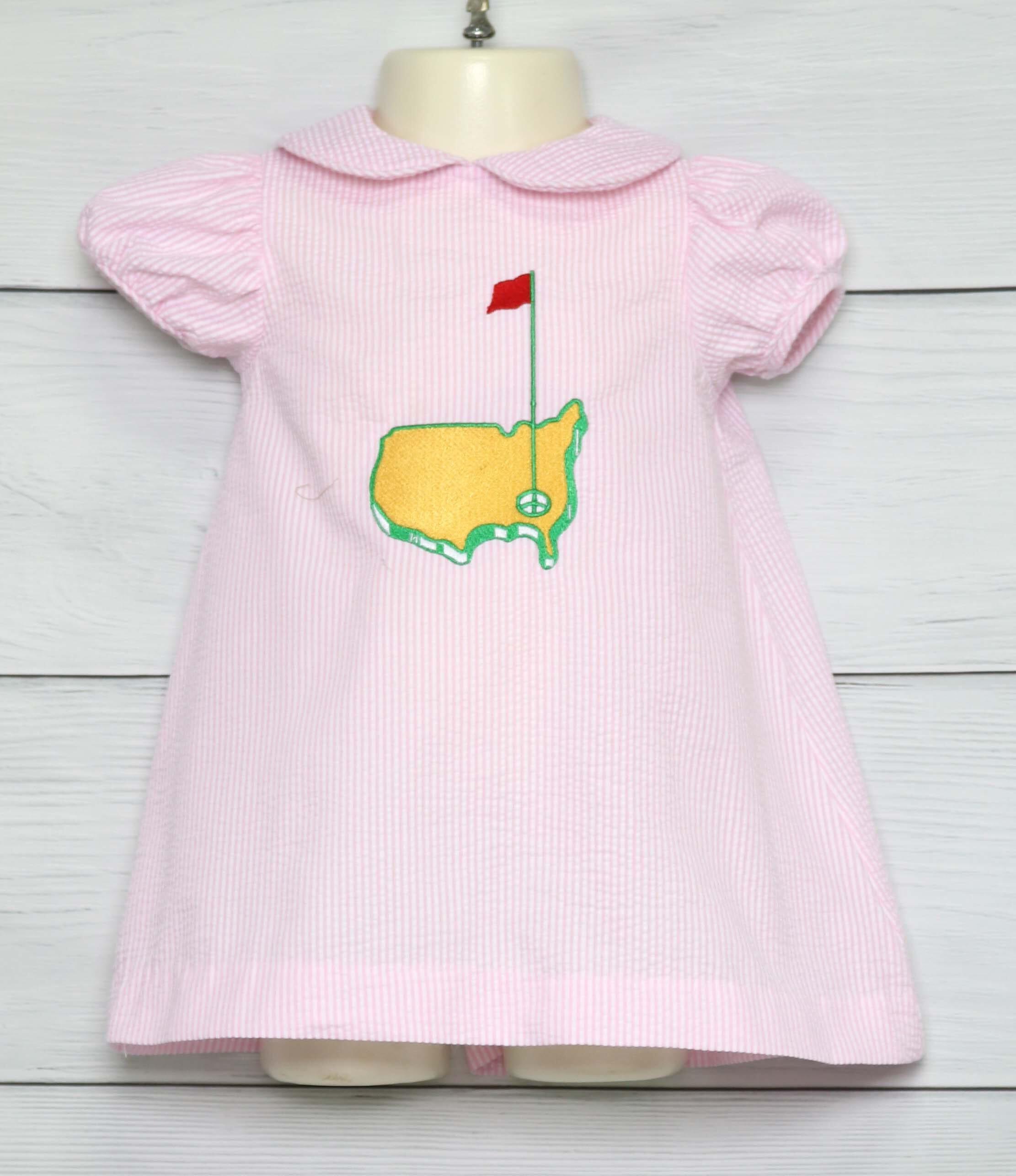 She will look amazing in first birthday outfits for girls by Zuli Kids. Golf birthday outfit is cotton pink seersucker and can come with or without applique and monogram.