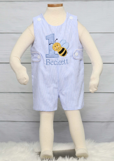 He will look one for his Bee Birthday party in a first birthday outfit by Zuli Kids. 1st birthday outfit is shown in blue seersucker and can be appliqued with a bumble bee first birthday design. A first name can also be added to this adorable toddler boy outfit. Numbers 1, 2, 3 and 4 are available. Can come with long or short pants.