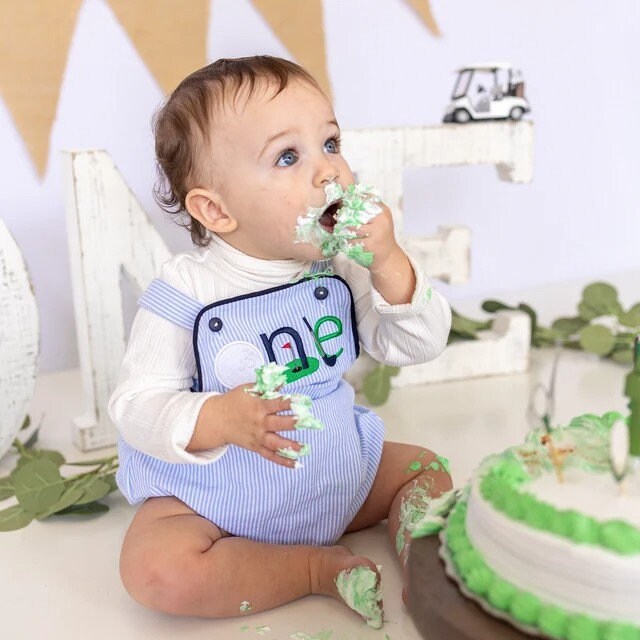 He will look stunning in a baby boy golf outfit for his hole in one Birthday by Zuli Kids. Baby golf outfit is shown in light blue seersucker with golf themed ONE embroidered on the front. Available with ONE only or with monogram added. Shirt shown on baby was purchased by the mother. We do not offer that shirt but can offer a shirt like shown separately in the picture.