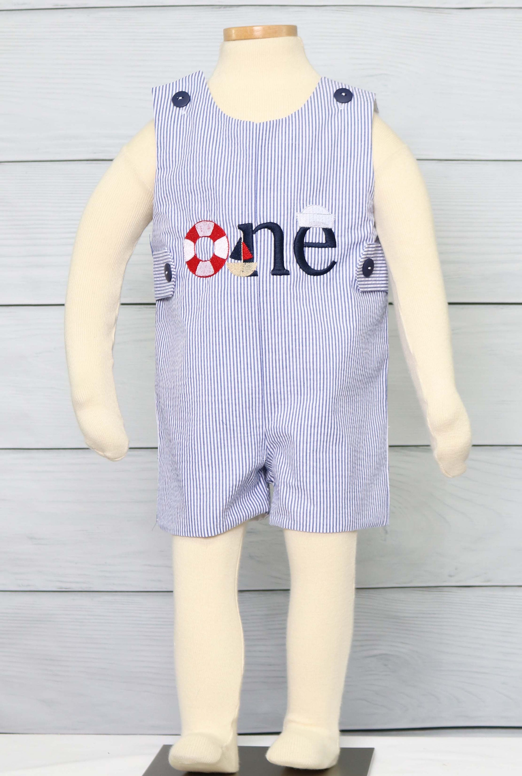 He will look amazing for his nautical first birthday outfit by Zuli Kids Baby boy first birthday romper is a baby boy shortall in navy seersucker stripe and comes with a nautical ONE design on the front. Matching diaper cover is available in separate listing (Style 294289)