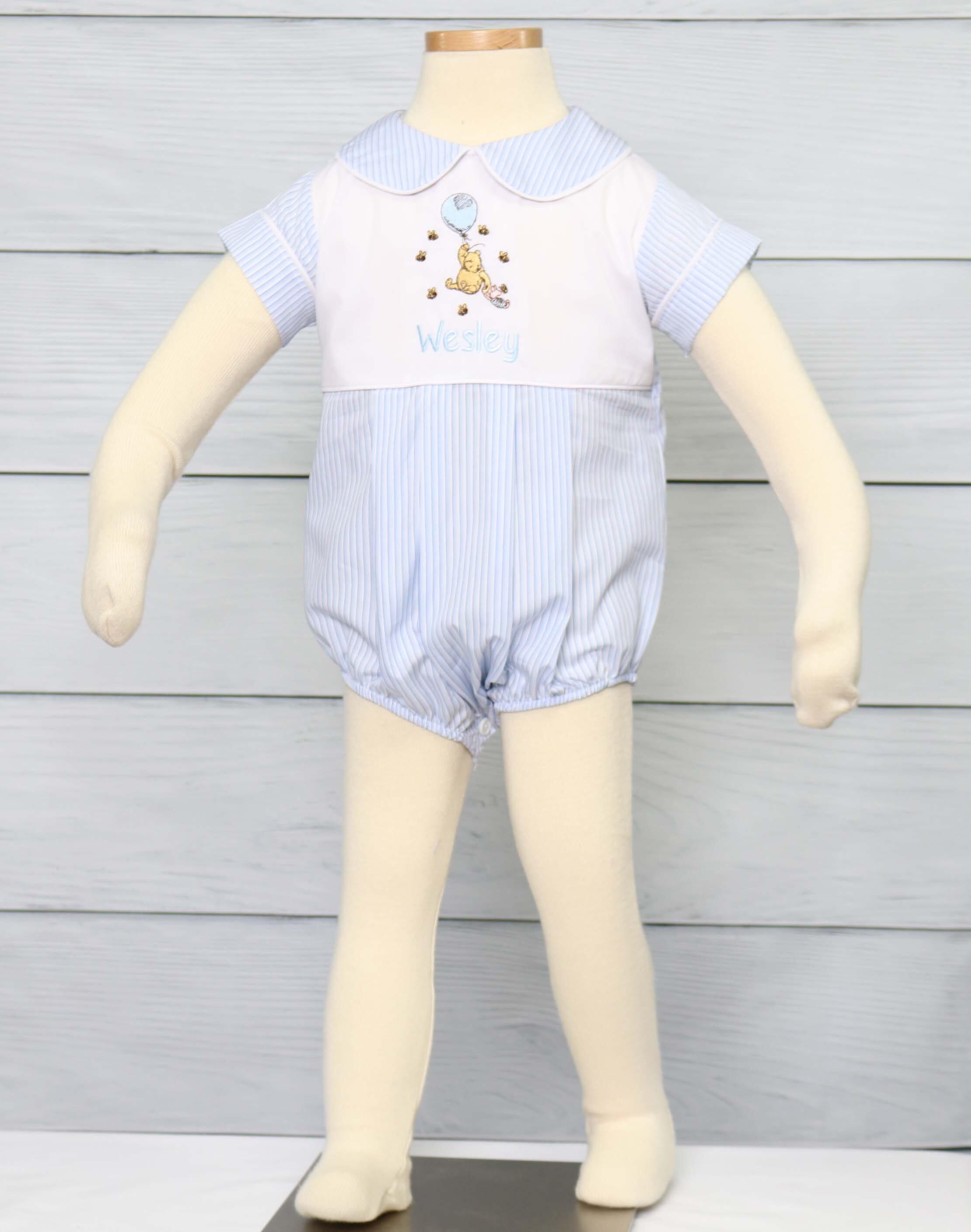 He will look stunning in newborn baby clothes for boy by Zuli Kids. Baby boy outfits are shown in baby blue stripe fabric baby with white front. Available plain (no embroidery on front),with classic bear inspired embroidery only or with embroidery and baby's first name.