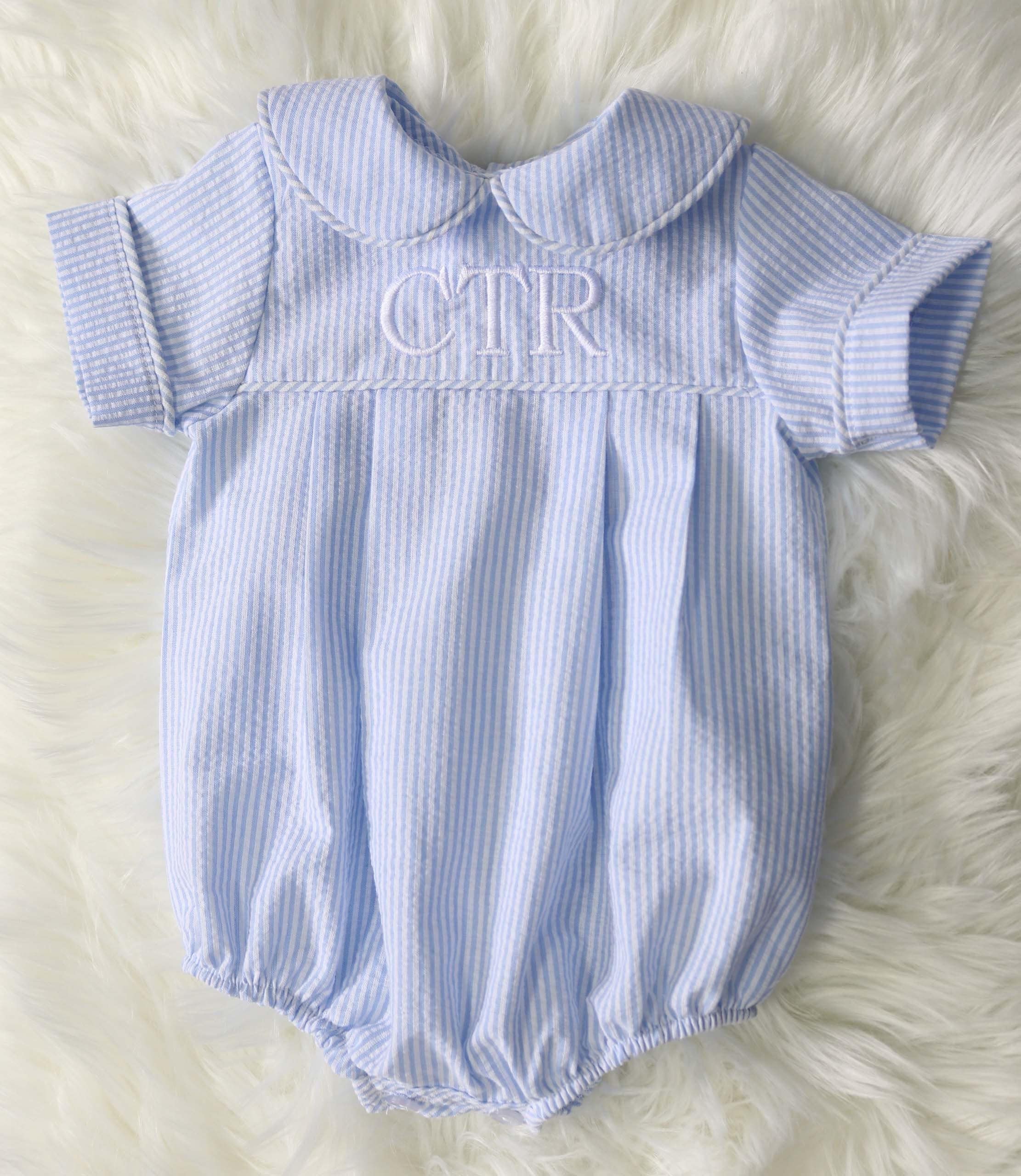 He will look amazing in a newborn boy coming home outfit by Zuli Kids. Baby boy coming home outfit is a blue seersucker baby boy bubble romper that is perfect for a baby shower gift. Available plain or monogrammed.