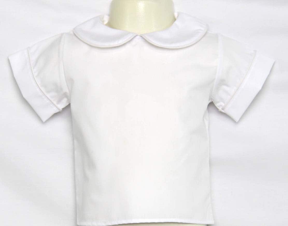 Peter Pan Collar shirt is perfect for any baby jon jon for Easter or Christmas. Zuli Kids offers baby boy dress clothes in many styles. Our baby shirts can be made to match any of our baby rompers that you choose. White dress shirt has white piping.