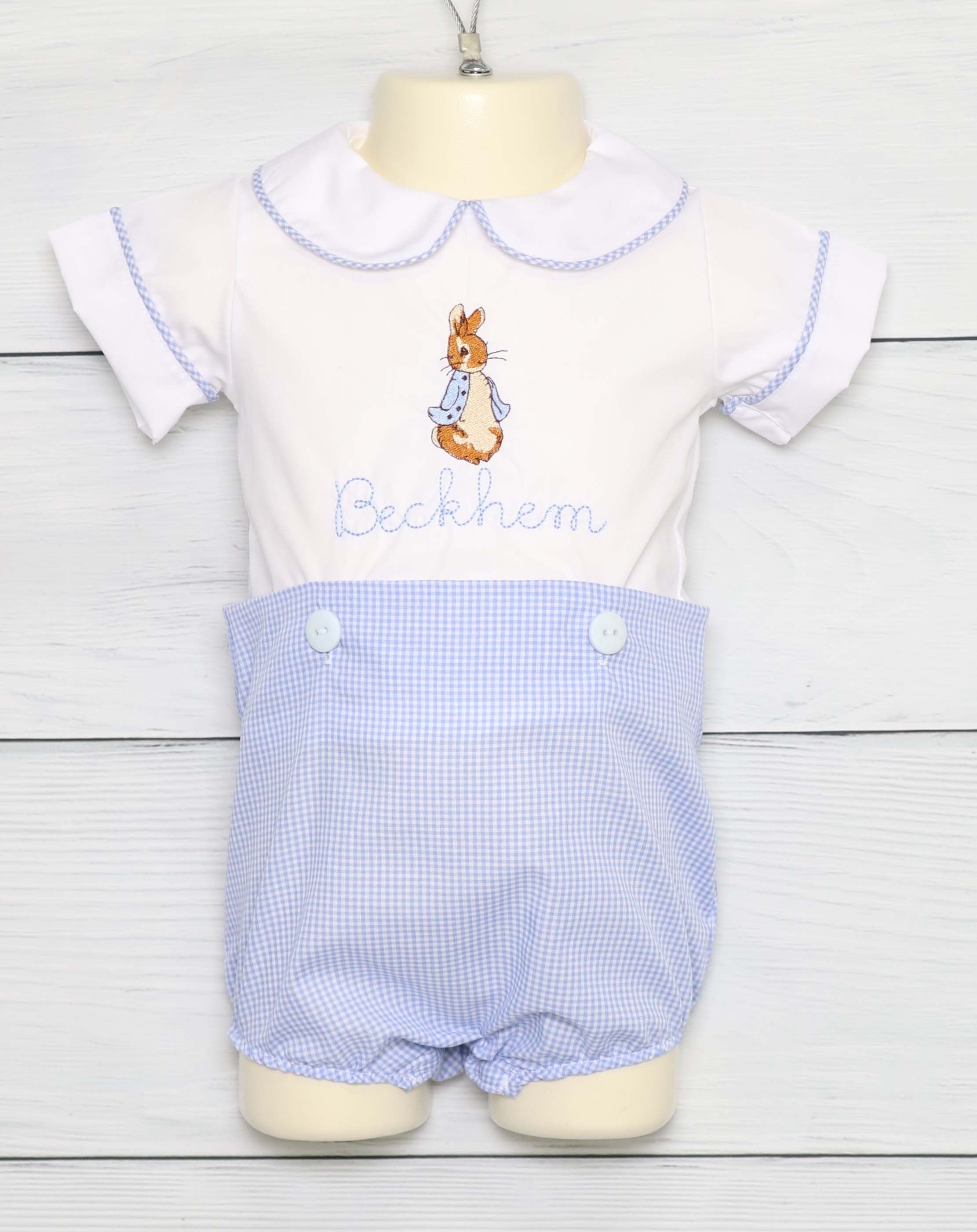 He will be the center of attention for his rabbit birthday party in a some bunny is one outfit by Zuli Kids. First birthday outfit for baby boy is a perfectt newborn Easter outfit with its blue gingham pants and a white dress shirt. Comes with peter rabbit design, or with rabbit and monogram (babys first name). Note: Only 9 Mo and larger have room for a name monogrammed on shirt.