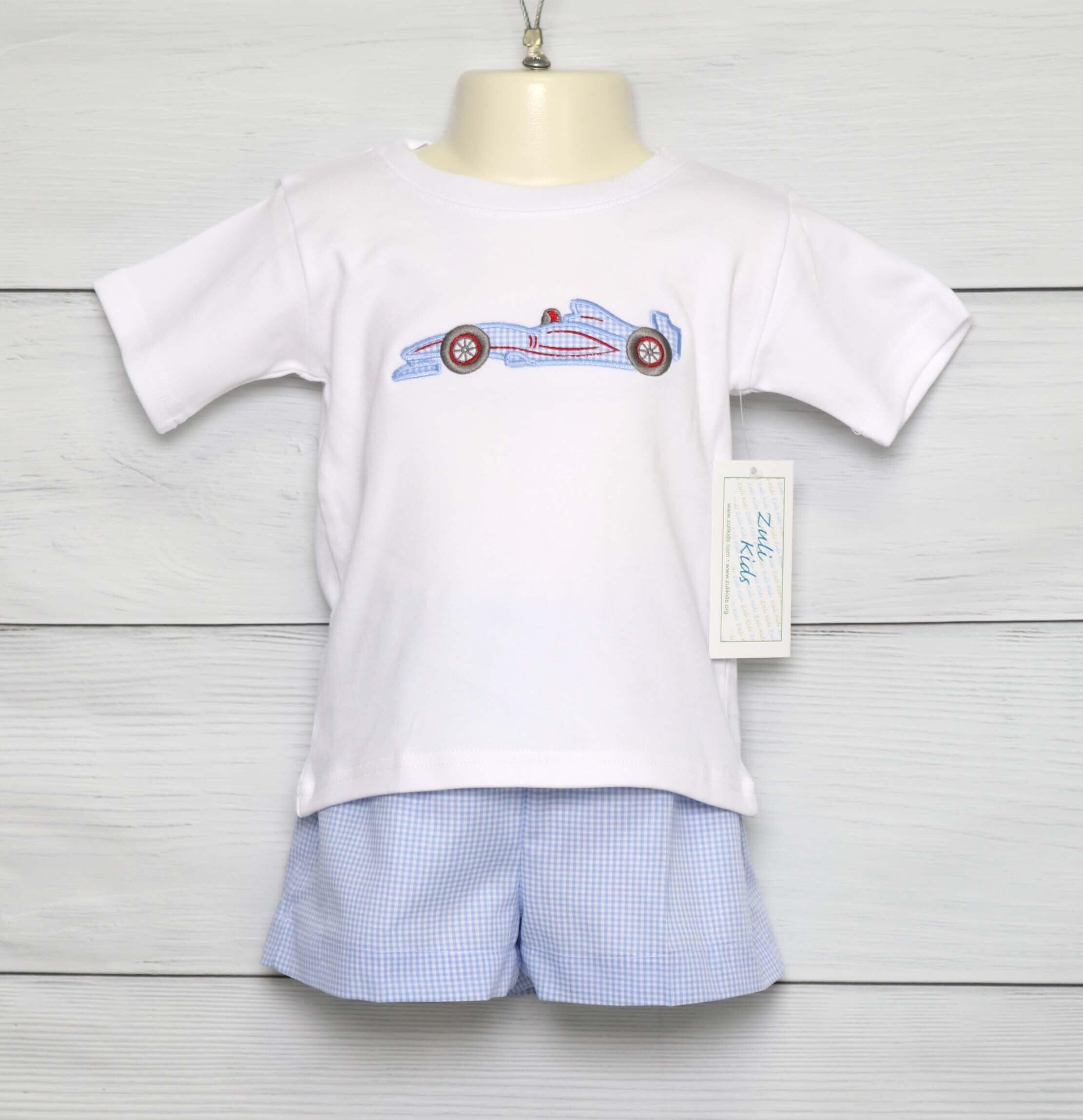 He will look so cute in a Race Car Birthday Outfit by Zuli Kids. 1st birthday outfit for boy has blue gingham shorts with white 100% Cotton t shirt and comes with race car design applique for a baby boy's birthday. Baby's first name can be added as a monogram under race car. •
