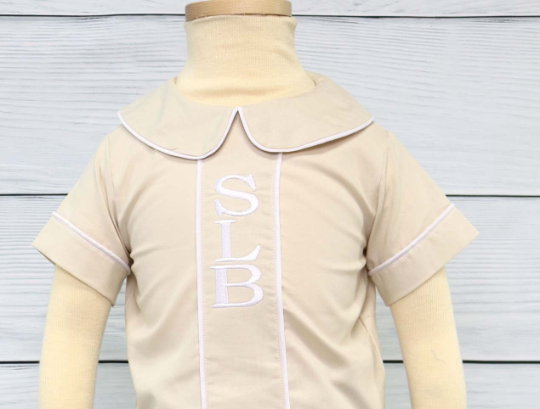 He will look super special in baby boy dress clothes by Zuli Kids. Boys ring bearer outfit is a Khaki two piece shorts set. Available plain, and can come with a vertical monogram.Our adorable, custom made baby boy clothing is the perfect addition for your little ones special day or is just as fabulous when given as a gift!