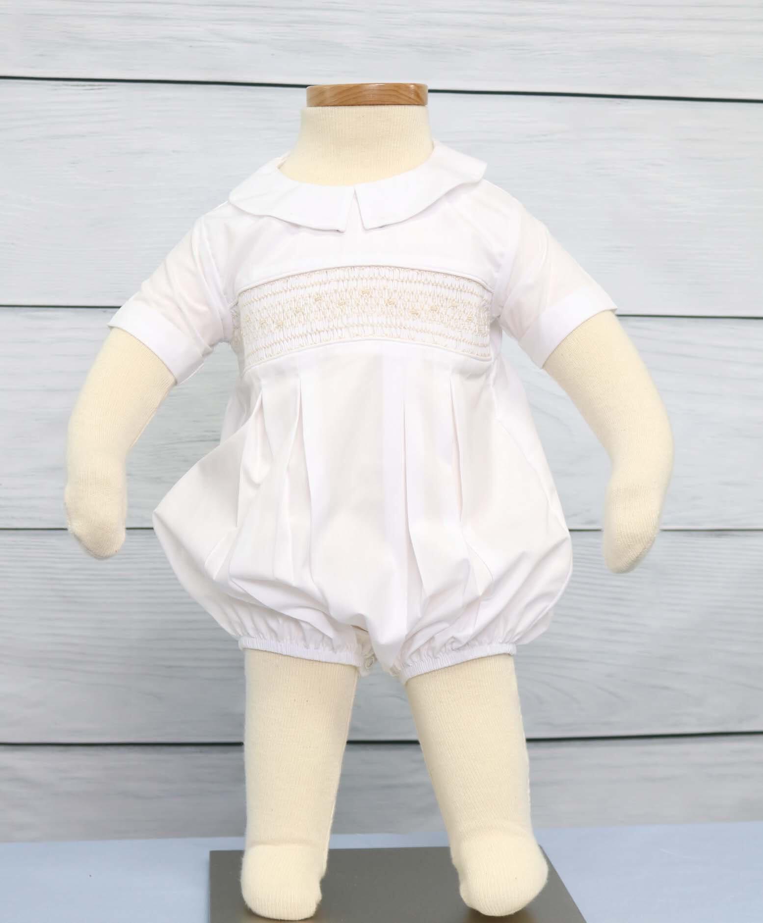 He will look stunning for his special day in christening baptism outfits by Zuli Kids. Baby boy christening outfit is white and smocked in ecru and is available for immediate shipping.