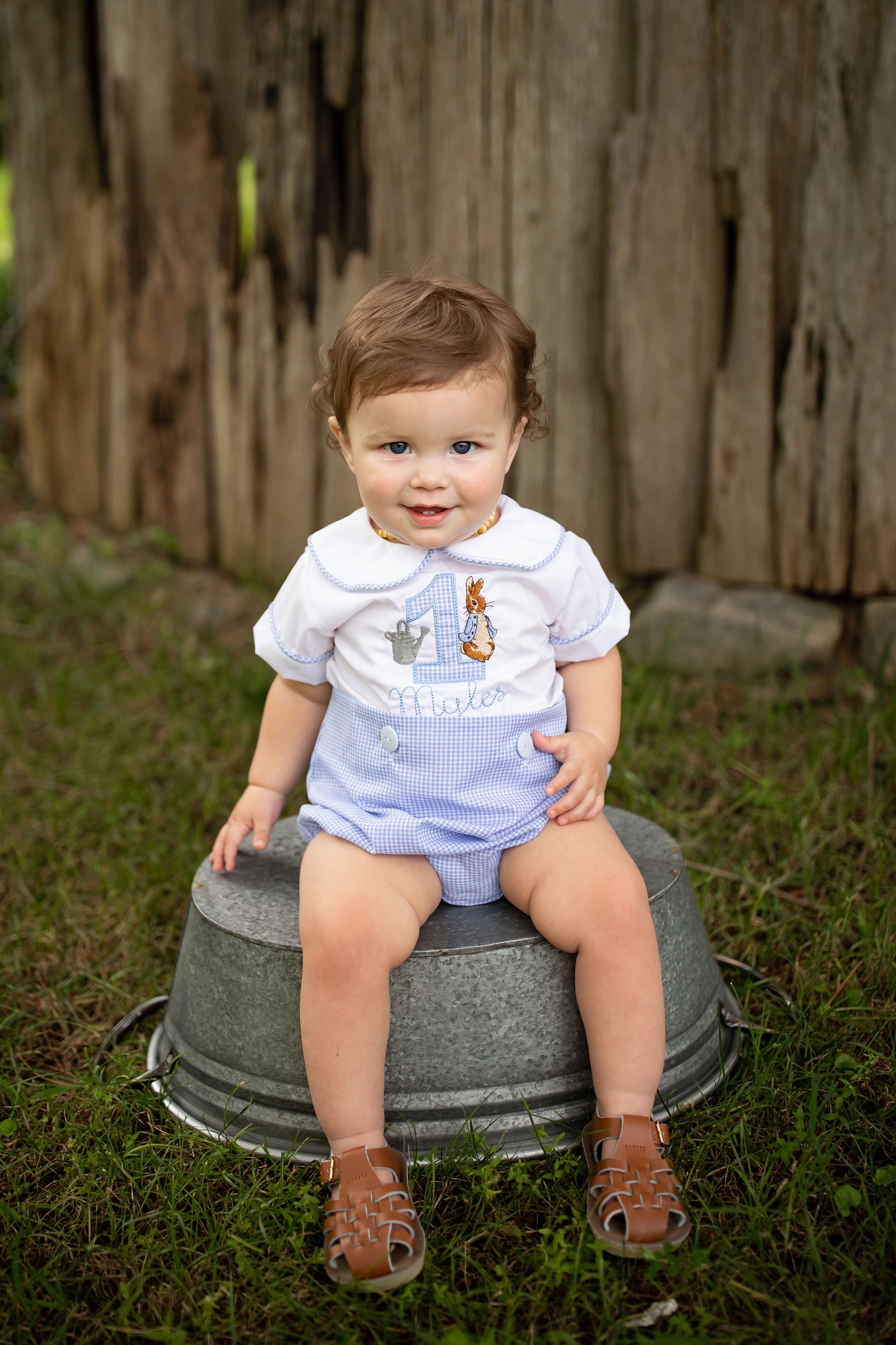He will be the center of attention at the big egg hunt in a baby boy Easter outfit by Zuli Kids. Toddler boy Easter outfit is blue gingham and can come plain, with peter rabbit design, or with applique and monogram.