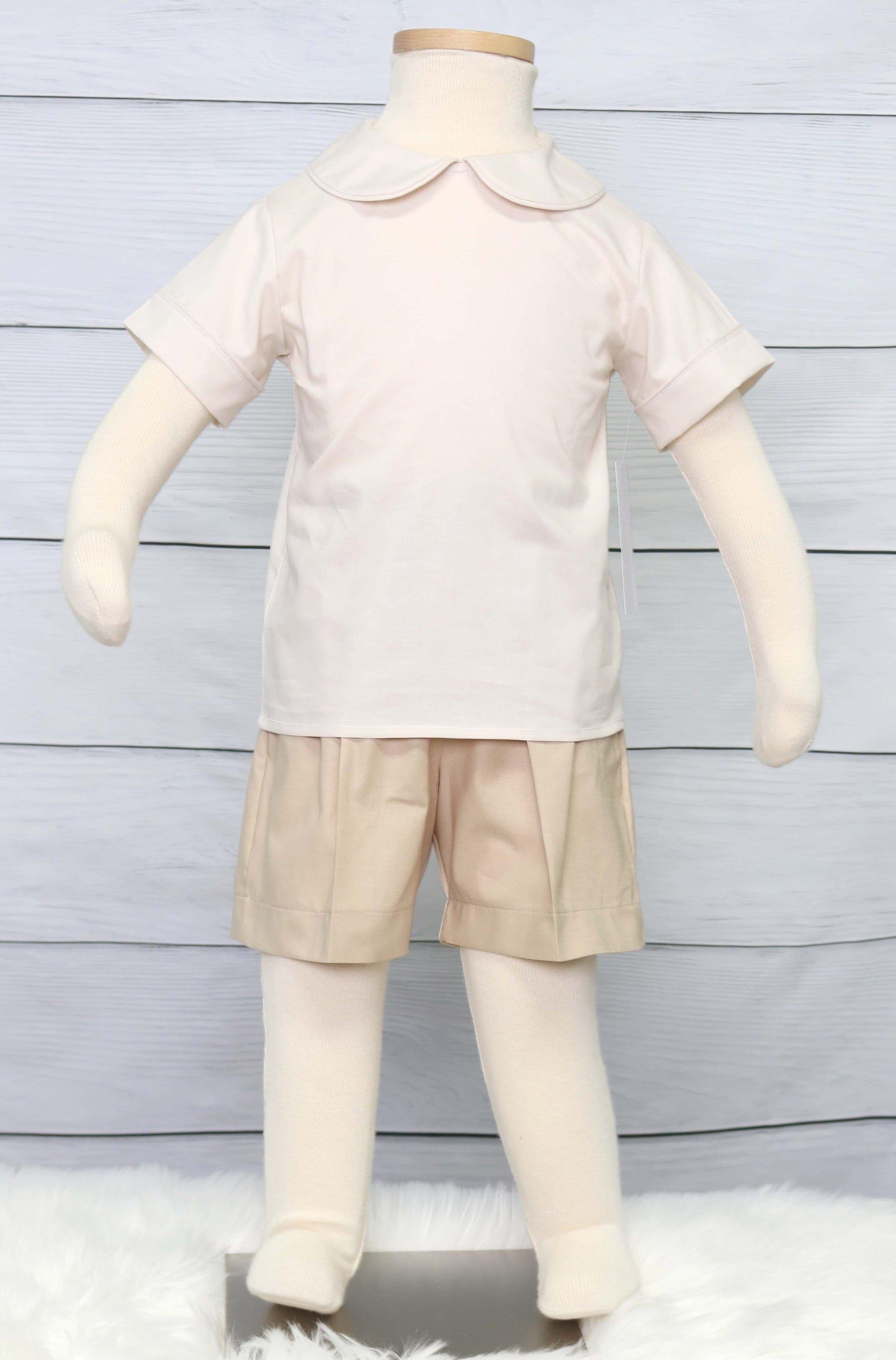Show him off in wedding outfits for toddlers by Zuli Kids. Boys wedding suit has khaki shorts with light beige shirt toddler boy shorts set. Available plain or with monogram. Matching Sibling Outfits available in separate listings.