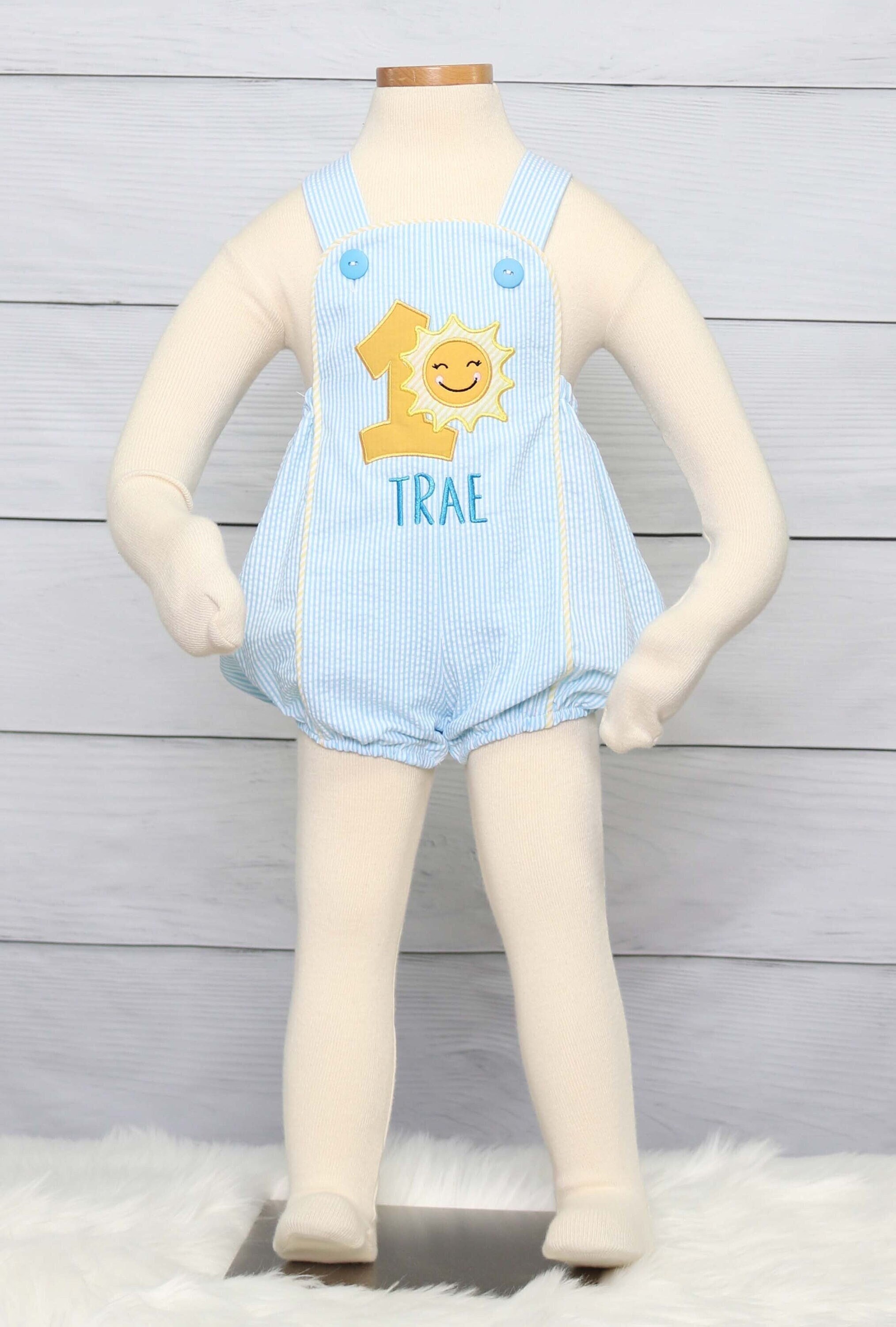 You'll love the way your baby boy looks in a You are my Sunshine outfit by Zuli Kids. You are my sunshine First Birthday Outfit is aqua seersucker with yellow seersucker piping and can come with you are my sunshine applique only or with applique and monogram your babies first name. Matching shirt available.